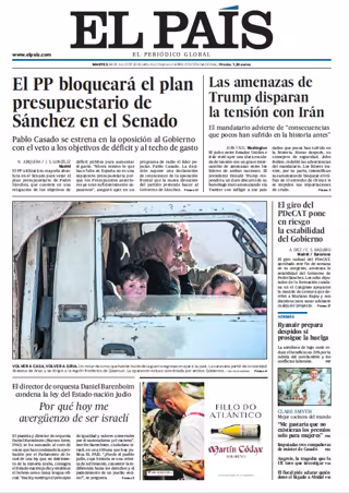 EL PAÍS: "El PP bloqueará el plan presupuestario de Sánchez en el Senado"; "Las amenazas de Trump disparan la tensión con Irán"; "Volver a casa, volver a Siria. Un millar de sirios que habían huido de la guerra regresaron ayer a su país"; "Por qué hoy me avergüenzo de ser israelí. El director de orquesta Daniel Baremboim condena la ley del Estado-nación judío"; "El giro del PDeCAT pone en riesgo la estabilidad del Gobierno"; "Ryanair prepara despidos si prosigue la huelga".
