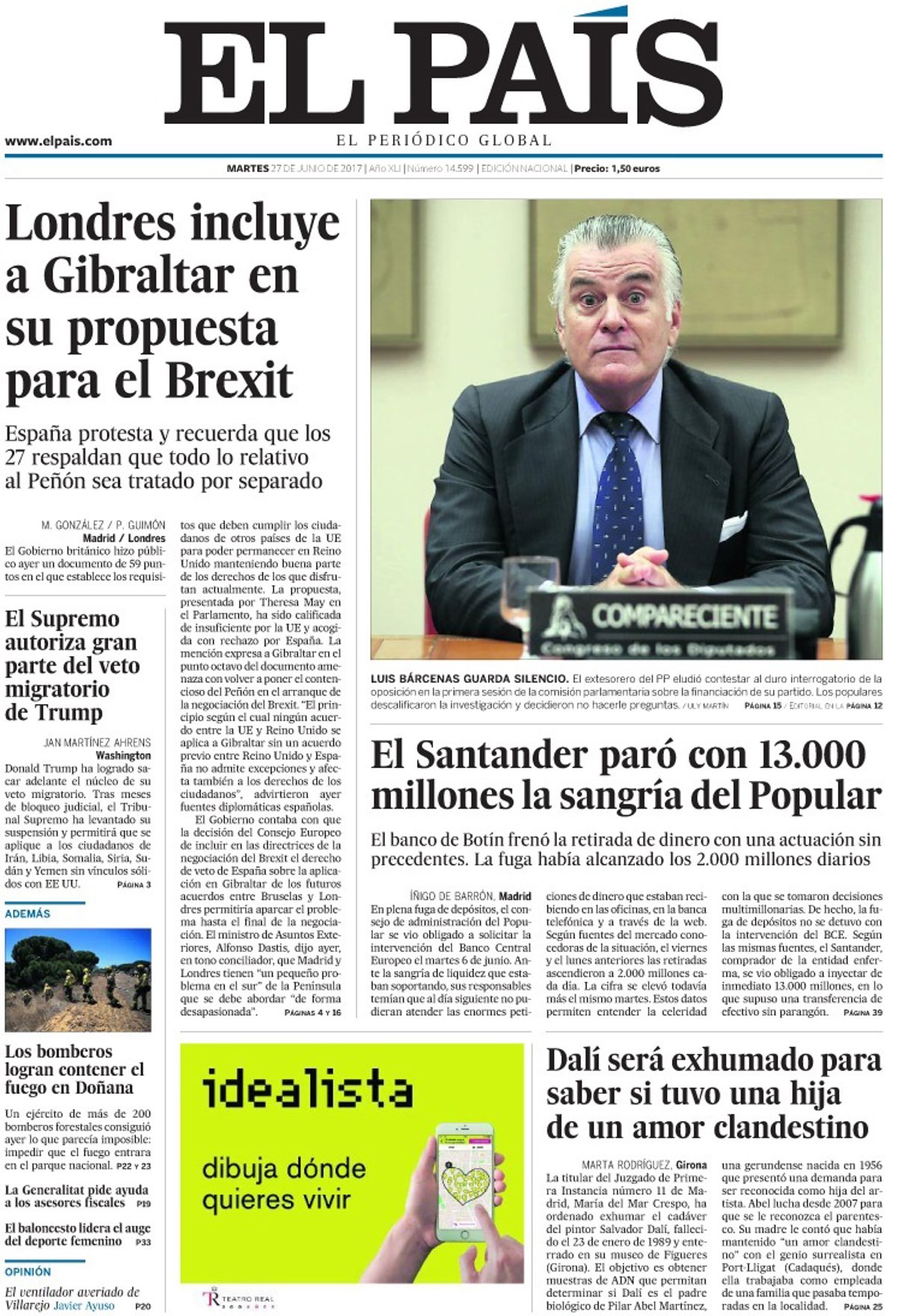 EL PAÍS: "Londres incluye a Gibraltar en su propuesta para el Brexit"; "El Santander paró con 13.000 millones la sangría del Popular"; "Dalí será exhumado para saber si tuvo una hija de un amor clandestino"; "El Supremo autoriza gran parte del veto migratorio de Trump"; "Los bomberos logran contener el fuego en Doñana".