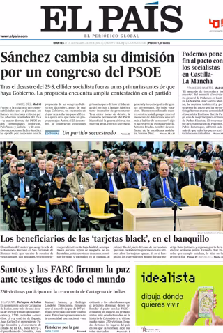 EL PAÍS: "Sánchez cambia su dimisión por un congreso del PSOE"; "Podemos pone fin al pacto con los socialistas en Castilla-La Mancha"; "Los beneficiarios de las 'tarjetas black', en el banquillo"; "Santos y las FARC firman la paz ante testigos de todo el mundo".