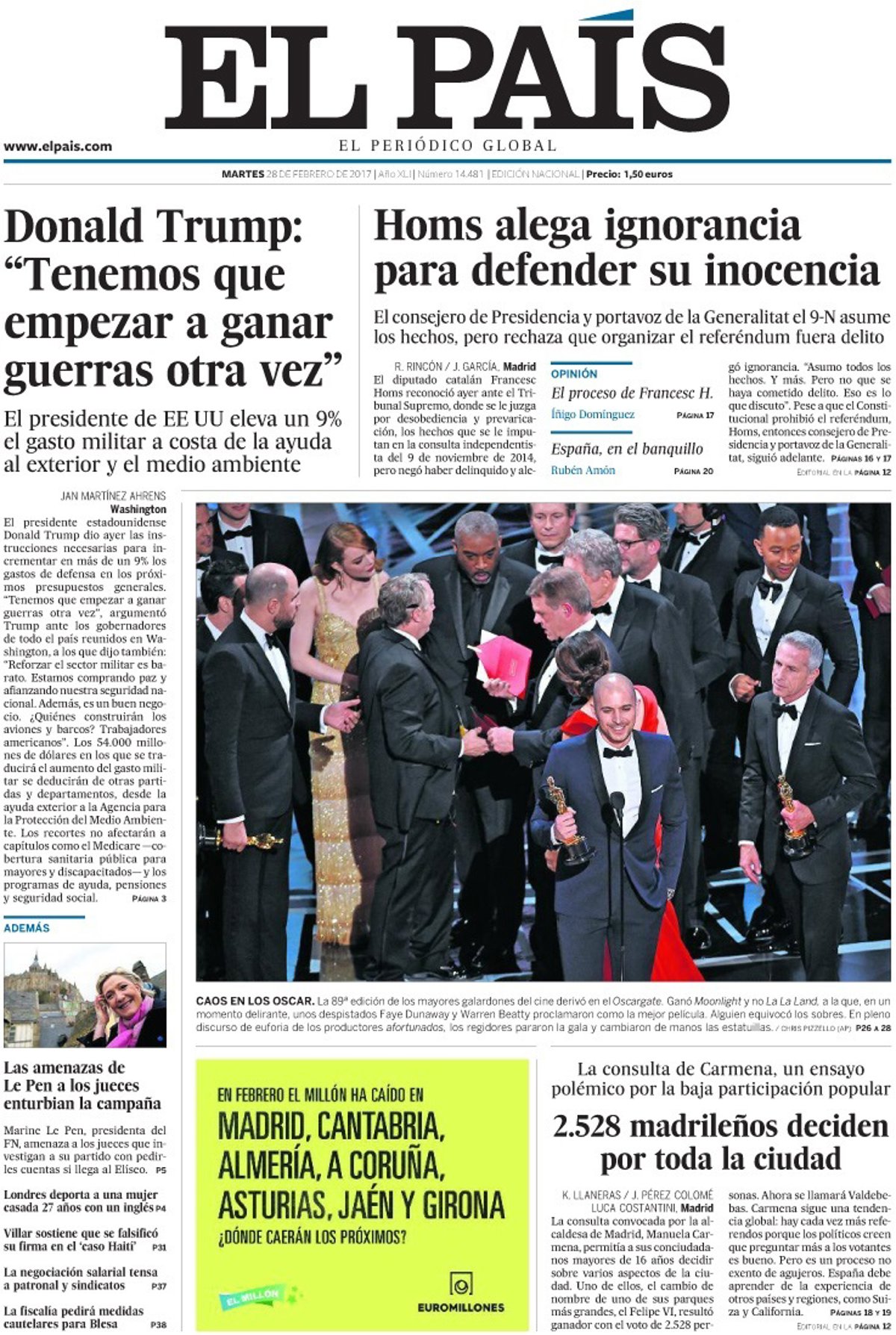 LA VANGUARDIA: "Homs niega al tribunal que quisiera desobedecer al TC el 9-N"; "Trump mutila el gasto social para comprar armas"; "Millet ante su juicio: "No puedo andar, que acabe ya esta tortura"; "Gala de los Oscars: la gran chapuza americana".