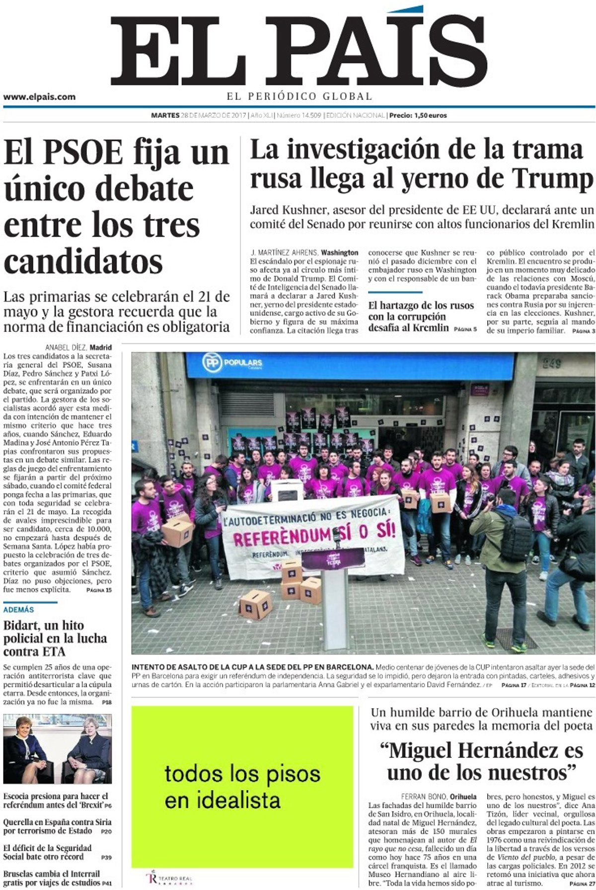 EL PAÍS: "El PSOE fija un único debate entre los tres candidatos"; "La investigación de la trama rusa llega al yerno de Trump"; "El hartazgo de los rusos con la corrupción desafía al Kremlin"; "Intento de asalto de la CUP a la sede del PP en Barcelona"; "Escocia presiona para hacer el referéndum antes del 'Brexit".