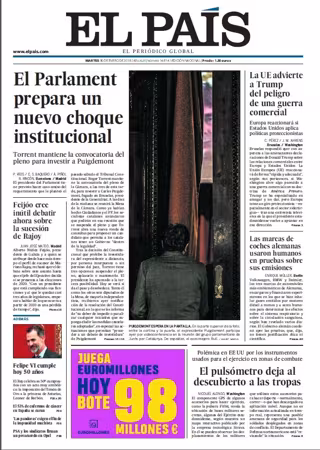EL PAÍS: "El Parlament prepara un nuevo choque institucional. Torrent mantiene la convocatoria del pleno para investir a Puigdemont. Puigdemont espera en la pantalla"; "El pulsómetro deja al descubierto a las tropas; "La UE advierte a Trump del peligro de una guerra comercial"; "Las marcas de coches alemanas usaron humanos en pruebas sobre sus emisiones"; "Feijóo cree inútil debatir ahora sobre la sucesión de Rajoy"; "Felipe VI cumple hoy 50 años".