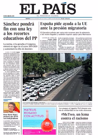 EL PAÍS: "Sánchez pondrá fin con una ley a los recortes educativos del PP"; "Los taxistas mantienen la protesta"; "España pide ayuda a la UE ante la presión migratoria"; "#MeTwo, un lema contra el racismo. Los ataques al jugador özil desatan una ola de solidaridad en las redes alemanas".
