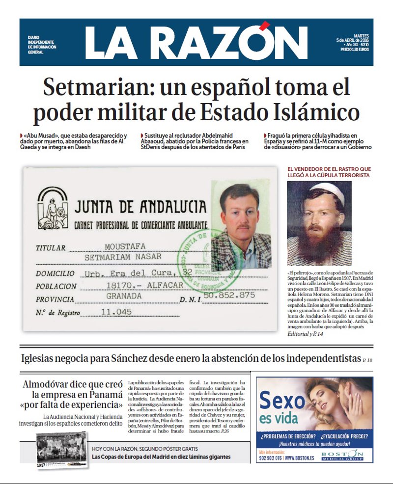 LA RAZÓN: "Setmarian: un español toma el poder militar de Estado Islámico"; "Iglesias negocia para Sánchez desde enero la abstención de los independentistas"; "Almodóvar dice que creó la empresa en Panamá por falta de experiencia".