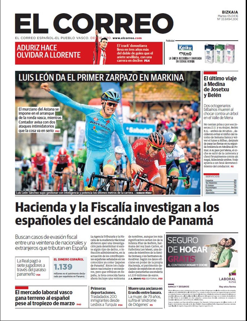 EL CORREO: "Hacienda y la Fiscalía investigan a los españoles del escándalo de Panamá"; "El mercado laboral vasco gana terreno al español pese al tropiezo de marzo"; "Primeras deportaciones. Trasladados 200 inmigrantes desde Lesbos a Turquía".