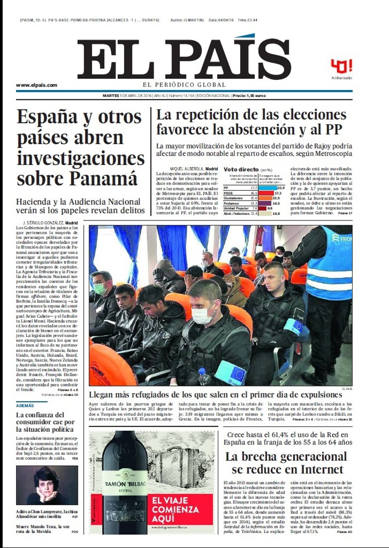 EL PAÍS: "España y otros países abren investigaciones sobre Panamá"; "La repetición de las elecciones favorece la abstención y al PP"; "Llegan más refugiados de los que salen en el primer día de expulsiones"; "La brecha generacional se reduce en Internet".