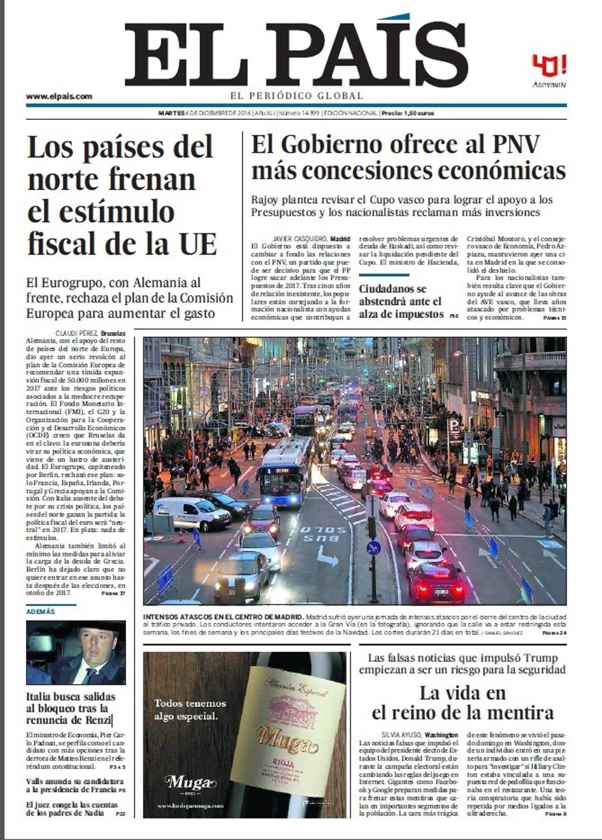 EL PAÍS: "Los países del norte frenan el estímulo fiscal de la UE"; "El Gobierno ofrece al PNV más concesiones económicas. Ciudadanos se abstendrá ante el alza de impuestos"; "Intensos atascos en el centro de Madrid"; "La vida en el reino de la mentira. Las falsas noticias que impulsó Trump empiezan a ser un riesgo para la seguridad"; "Italia busca salidas al bloqueo tras la renuncia de Renzi".