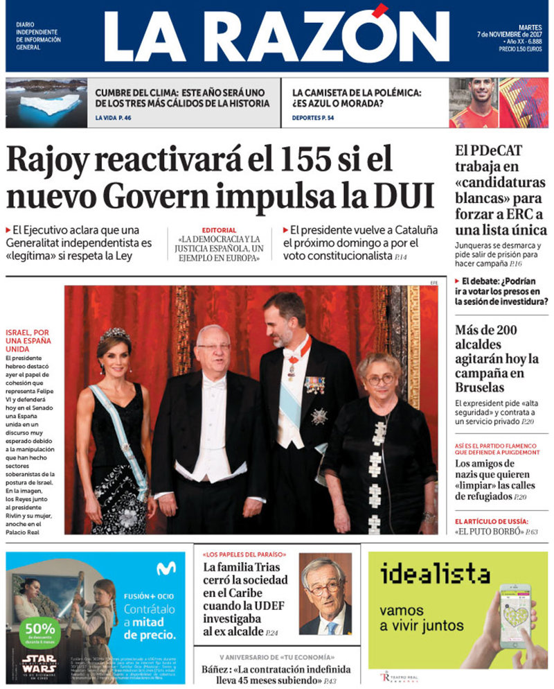 LA RAZÓN: "Rajoy reactivará el 155 si el nuevo Govern impulsa la DUI"; "El PDeCAT trabaja en "candidaturas blancas" para forzar a ERC a una lista única"; "Más de 200 alcaldes agitarán hoy la campaña en Bruselas"; "La familia Trias cerró la sociedad en el Caribe cuando la UDEF investigaba al ex alcalde".