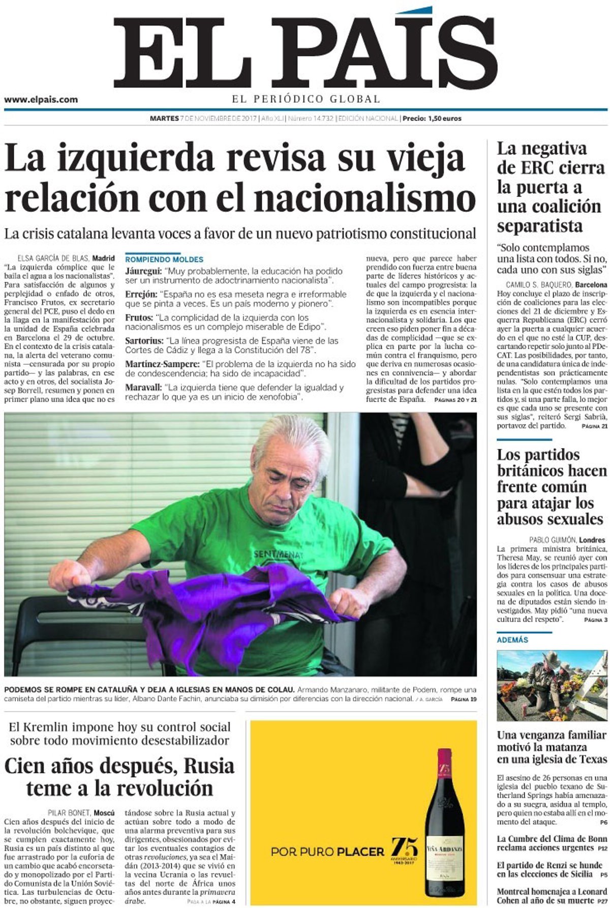 EL PAÍS: "La izquierda revisa su vieja relación con el nacionalismo"; "La negativa de ERC cierra la puerta a una coalición separatista"; "Los partidos británicos hacen frente común para atajar los abusos sexuales"; "Cien años después, Rusia teme a la revolución. El Kremlin impone hoy su control social sobre todo movimiento desestabilizador".