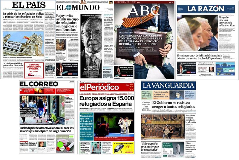 EL PAÍS: "La crisis de los refugiados obliga a planear bombardeos en Siria"; "División en el Ejecutivo por las cuotas de asilados"; "Un cómico antipolíticos quiere salvar Guatemala"; "La Tercera Vía presenta hoy una propuesta de negociación para Cataluña"; "Izquierda Unida acepta todas las condiciones de Podemos para ir en su candidatura".