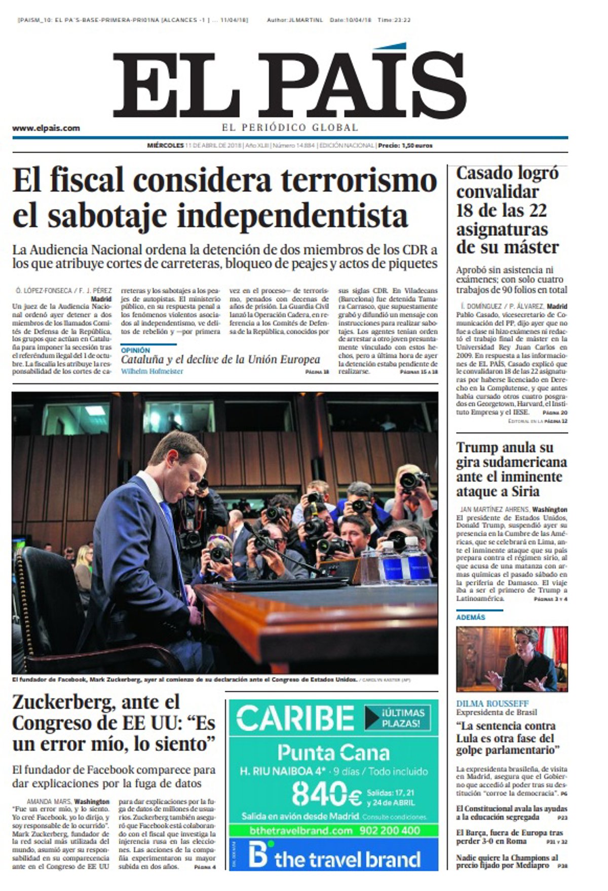 EL PAÍS: "El fiscal considera terrorismo el sabotaje independentista"; "Casado logró convalidar 18 de las 22 asignaturas de su máster"; "Zuckerberg, ante el Congreso de EE UU: 'Es un error mío, lo siento'"; "Trump anula su gira sudamericana ante el inminente taque a Siria".