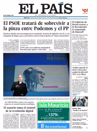 EL PAÍS: "El PSOE tratará de sobrevivir a la pinza entre Podemos y el PP. El PSC entra en el gobierno municipal de Barcelona para apoyar a Ada Colau"; "El usuario toma el control de la revolución digital. El País Retina reúne a los mayores expertos en transformación tecnológica"; "El Gobierno de Brasil recurre a la desesperada la suspensión de Rousseff"; "Arabia concede 14 meses más para acabar la obra del AVE a La Meca".