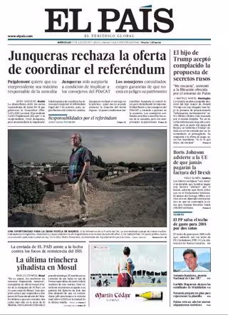 EL PAÍS: "Junqueras rechaza la oferta de coordinar el referéndum"; "Una oportunidad para la gran favela de Madrid. A 14 kilómetros de la Puerta del Sol, un enmarañado paisaje de clases medias, trabajadores inmigrantes, chabolismo y especuladores ha ido fraguándose a las bravas durante 40 años. Es la Cañada Real"; "La última trinchera yihadista en Mosul. La enviada de El País asiste a la lucha contra los focos de resistencia del ISIS"; "El hijo de Trump aceptó complacido la propuesta de secretos rusos"; "Boris Johnson advierte a la UE de que jamás pagarán la factura del Brexit".