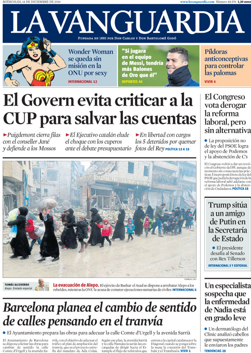 EL PERIÓDICO: "Escalada de tensión entre CUP y Govern"; "El FMI pide a España una subida gradual del IVA reducido"; "Desesperados. La batalla de Alepo llega a su fin en medio de matanzas de civiles y una evacuación dramática".