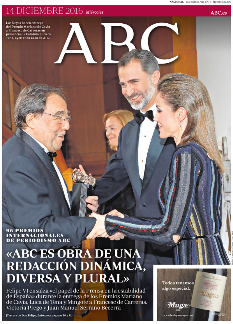 ABC: "ABC es obra de una redacción dinámica, diversa y plural. Felipe VI ensalza "el papel de la Prensa en la estabilidad de España" durante la entrega de los Premios Mariano de Cavia, Luca de Tena y Mingote a Francesc de Carreras, Victoria Prego y Juan Manuel Serrano Becerra".