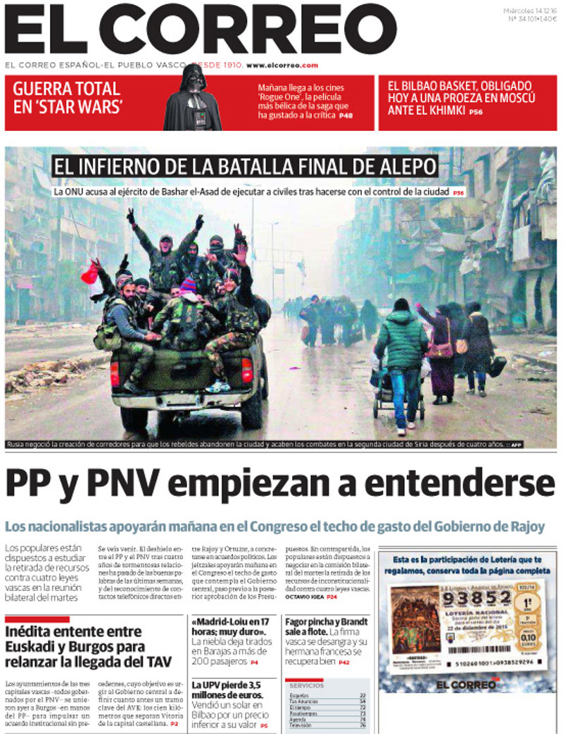 EL CORREO: "PP y PNV empiezan a entenderse. Los nacionalistas apoyarán mañana en el Congreso el techo de gasto del Gobierno de Rajoy"; "El infierno de la batalla final de Alepo"; "Inédita entente entre Euskadi y Burgos para relanzar la llegada del TAV".
