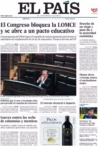 EL PAÍS: "El Congreso bloquea la LOMCE y se abre a un pacto educativo"; "Polémica por el voto a Fernández Díaz para presidir la Comisión de Exteriores"; "Bruselas da un viraje y pone fin a la austeridad económica"; "Obama alerta a Europa contra el nacionalismo étnico"; "Guerra contra las webs de calumnias y mentiras".