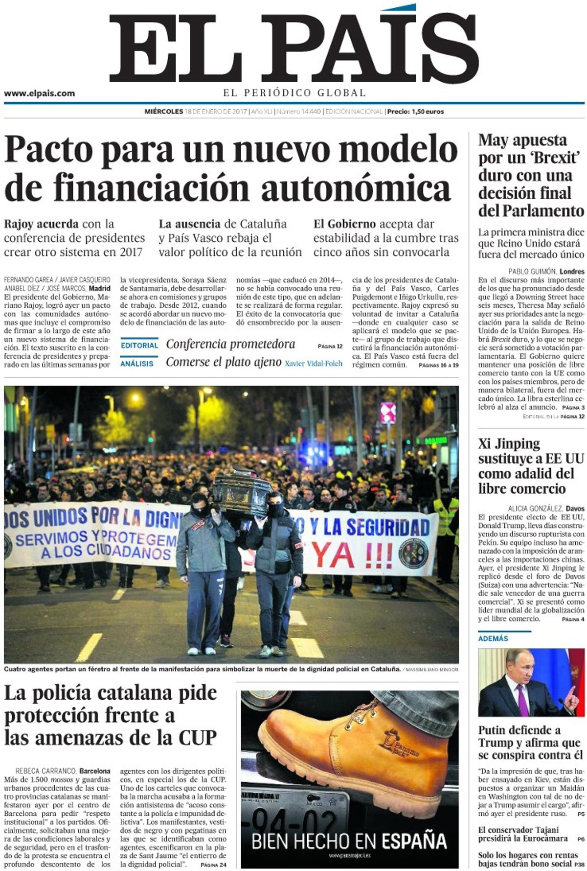 EL PAÍS: "Pacto para un nuevo modelo de financiación autonómica"; "La policía catalana pide protección frente a las amenazas de la CUP"; "May apuesta por un 'Brexit' duro con una decisión final del Parlamento"; "Xi Jinping sustituye a EE UU como adalid del libre comercio"; "Putin defiende a Trump y afirma que se conspira contra él".