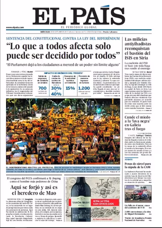EL PAÍS: ""Lo que afecta a todos solo puede ser decidido por todos". Sentencia del Constitucional contra la ley del referéndum"; "El independentismo reactiva las protestas. Miles de personas se manifestaron anoche en Barcelona y otras ciudades catalanas, con velas en la mano y en silencio, para exigir la libertad de los "presos políticos" Jordi Sànchez y Jordi Cuixart, encarcelados por promover las revueltas separatistas"; "Aquí se forjó y así es el heredero de Mao"; "Las milicias antiyihadistas reconquistan el bastión del ISIS en Siria"; "Cunde el miedo a la 'lava negra' en Galicia tras el fuego".