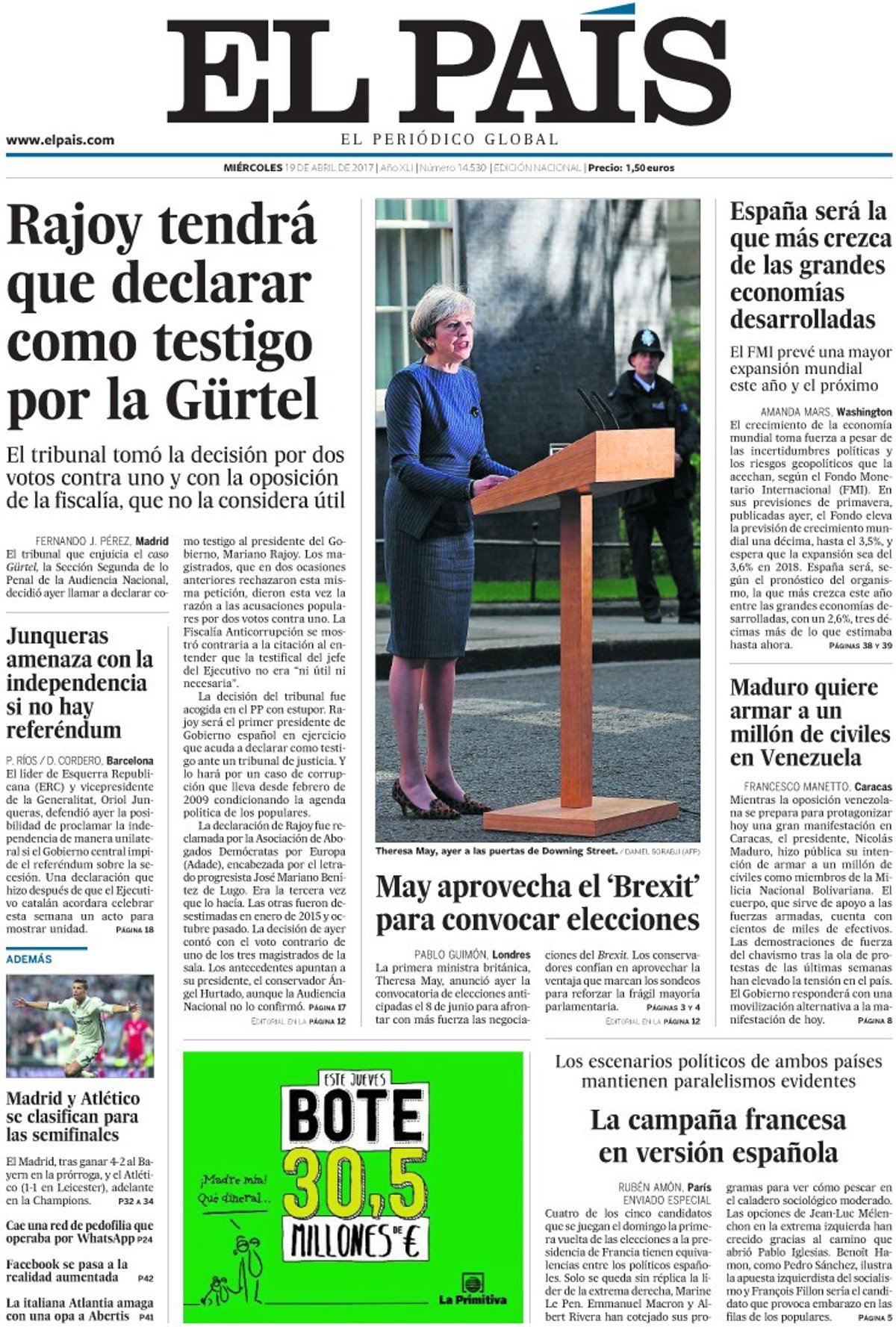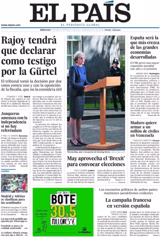 EL PAÍS: "Rajoy tendrá que declarar como testigo por la Gürtel"; "May aprovecha el 'Brexit' para convocar elecciones"; "España será la que más crezca de las grandes economías desarrolladas"; "Maduro quiere armar a un millón de civiles en Venezuela"; "Junqueras amenaza con la independencia si no hay referéndum".