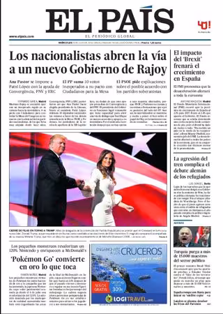 EL PAÍS: "Los nacionalistas abren la vía a un nuevo Gobierno de Rajoy. Ana Pastor se impone a Patxi López con la ayuda de Convergéncia, PNV y ERC"; "Cierre de filas en torno a Trump; "'Pokémon Go' convierte en oro lo que toca. Los pequeños monstruos revalorizan un 120% Nintento y enriquecen a McDonald's"; "El impacto del 'Brexit' frenará el crecimiento en España"; "La agresión del tren complica el debate alemán de los refugiados"; "Turquía purga más de 15.000 maestros del sector público".
