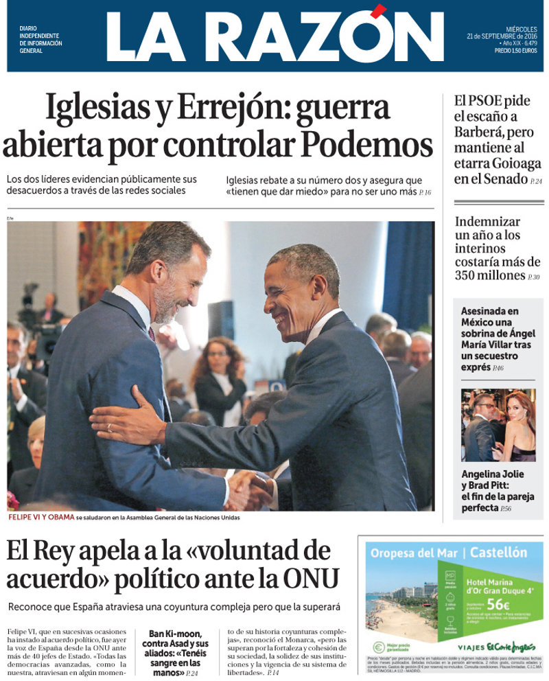 LA RAZÓN: "Iglesias y Errejón: guerra abierta por controlar Podemos"; "El Rey apela a la "voluntad de acuerdo" político ante la ONU"; "El PSOE pide el escaño a Barberá, pero mantiene al etarra Goioaga en el Senado"; "Indemnizar un año a los interinos costaría más de 350 millones".