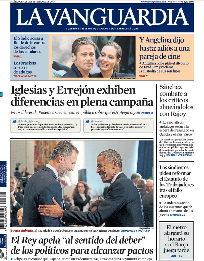LA VANGUARDIA: "Iglesias y Errejón exhiben diferencias en plena campaña"; "El Rey apela "al sentido del deber" de los políticos para alcanzar pactos"; "Sánchez combate a los críticos alineándose con Rajoy"; "Los sindicatos piden reformar el Estatuto de los Trabajadores tras el fallo europeo"; "El metro alargará su horario si el Barça juega tarde".