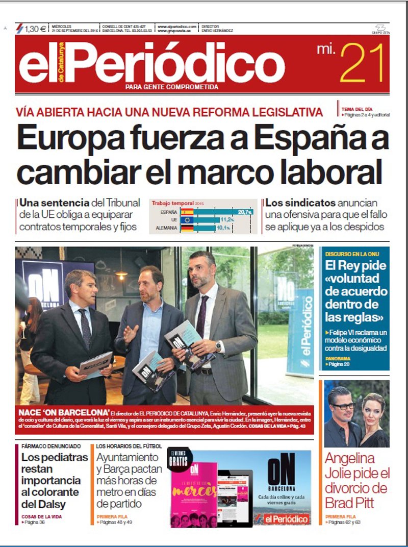 EL PERIÓDICO: "Europa fuerza a España a cambiar el marco laboral"; "Nace 'On Barcelona'"; "El Rey pide "voluntad de acuerdo dentro de las reglas""; "Los pediatras restan importancia al colorante del Dalsy"; "Ayuntamiento y Barça pactan más horas de metro en días de partido"; "Angelina Jolie pide el divorcio de Brad Pitt".