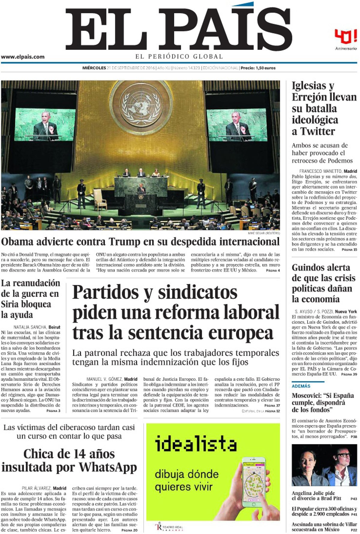 EL PAÍS: "Partidos y sindicatos piden una reforma laboral tras la sentencia europea"; "Obama advierte contra Trump en su despedida internacional"; "Iglesias y Errejón llevan su batalla ideológica a Twitter"; "Guindos alerta de que las crisis políticas dañan la economía"; "La reanudación de la guerra en Siria bloquea la ayuda".
