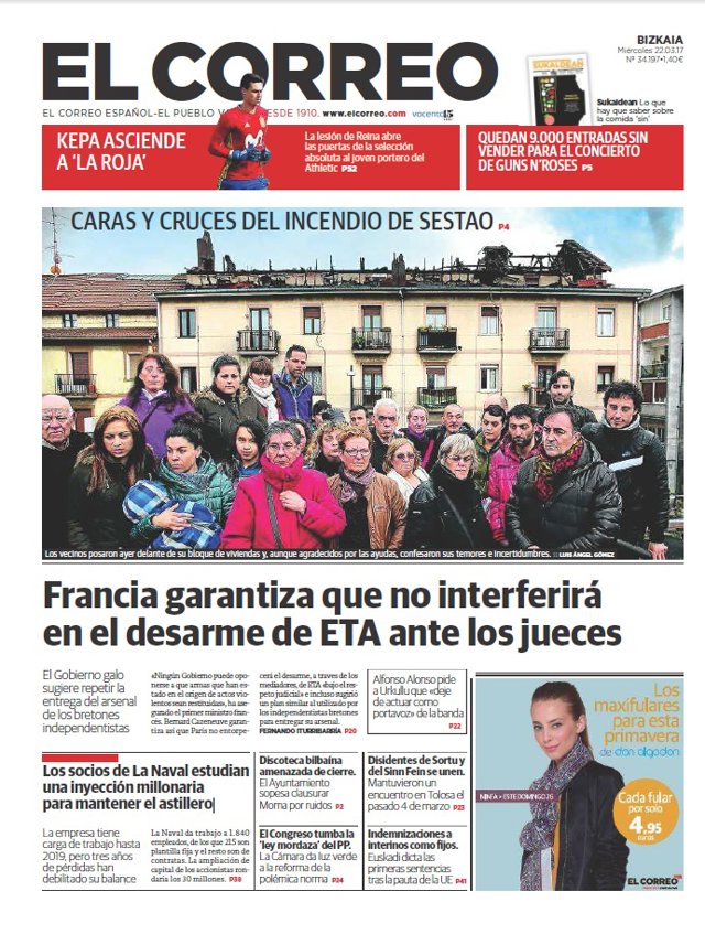 EL CORREO: "Caras y cruces del incendio de Sestao"; "Francia garantiza que no interferirá en el desarme de ETA ante los jueces"; "Los socios de La Naval estudian una inyección millonaria para mantener el astillero".