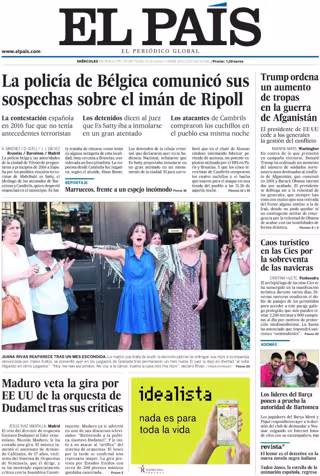 EL PAÍS: "La policía de Bélgica comunicó sus sospechas sobre el imán de Ripoll"; "Maduro veta la gira por EE UU de la orquesta de Dudamel tras sus críticas"; "Trump ordena un aumento de tropas en la guerra de Afganistán"; "Caos turístico en las Cíes por la sobreventa de las navieras"; "Juana Rivas reaparece tras un mes escondida".