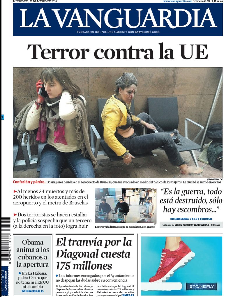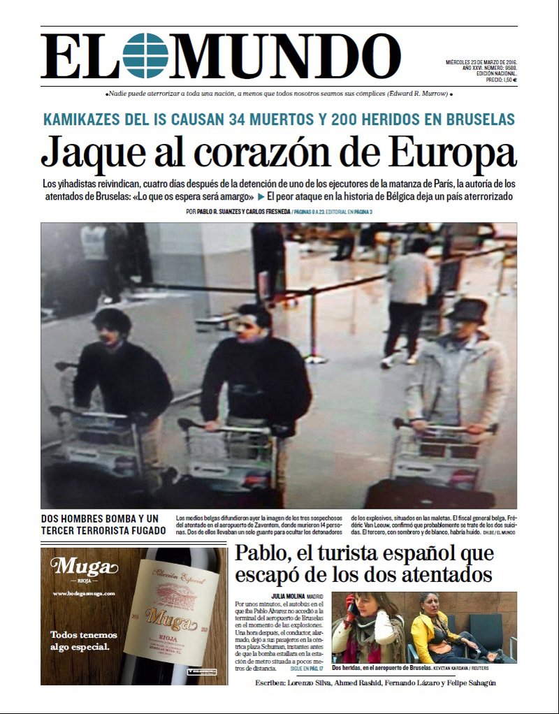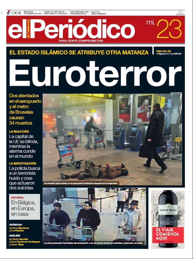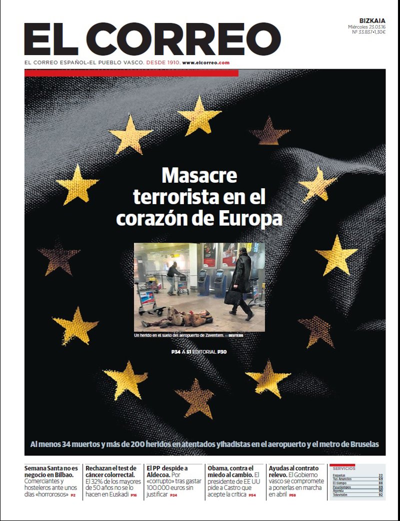 EL CORREO: "Masacre terrorista en el corazón de Europa. Al menos 34 muertos y más de 200 heridos en atentados yihadistas en el aeropuerto y el metro de Bruselas".