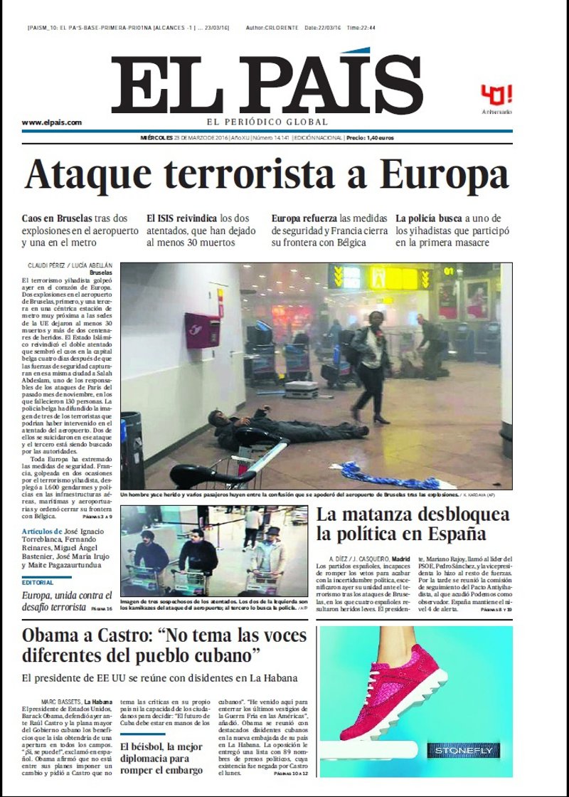 EL PAÍS: "Ataque terrorista en Europa. Caos en Bruselas tras dos explosiones en el aeropuerto y una en el metro. El ISIS reivindica los dos atentados, que han dejado al menos 30 muertos"; "La matanza desbloquea la política en España"; "Obama a Castro: "No temas las voces diferentes del pueblo cubano". El béisbol, la mejor diplomacia para romper el embargo".