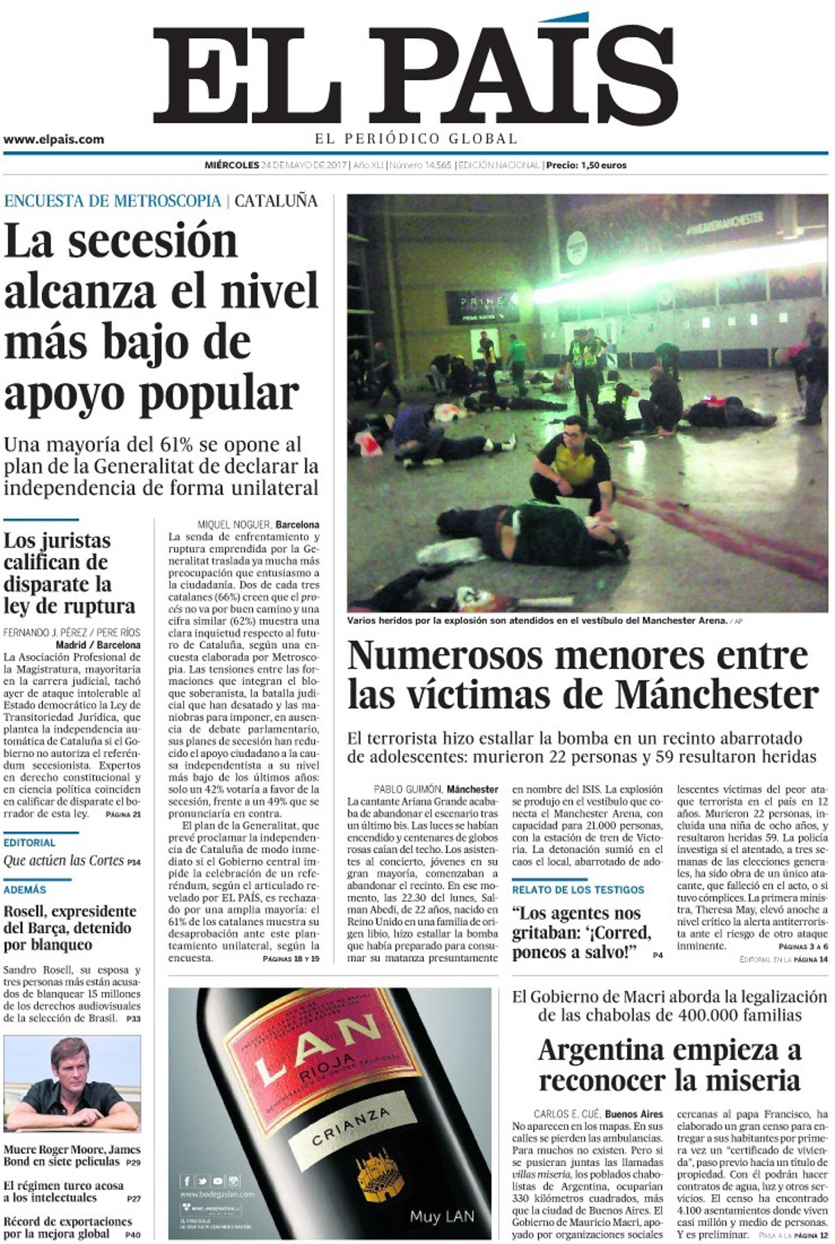 EL PAÍS: "La secesión alcanza el nivel más bajo de apoyo popular"; "Numerosos menores entre las víctimas de Mánchester"; "Los juristas califican de disparate la ley de ruptura"; "Argentina empieza a reconocer la miseria: El Gobierno de Macri aborda la legalización de las chabolas de 400.000 familias".