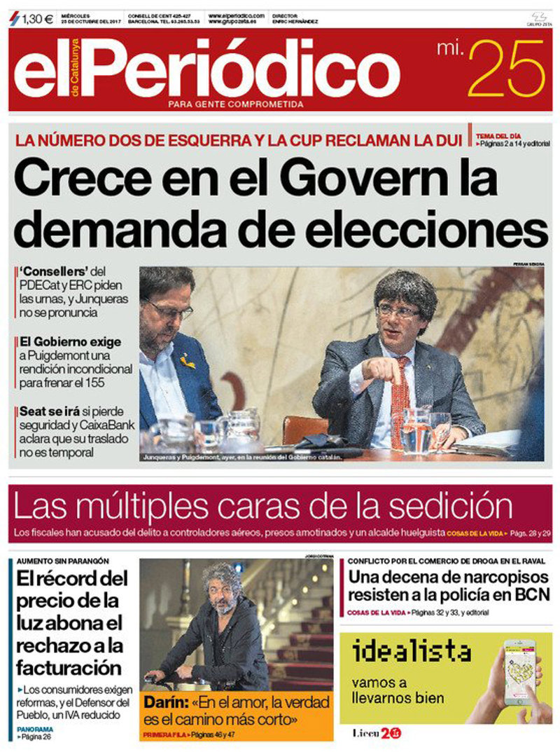 EL PERIÓDICO: "Crece en el Govern la demanda de elecciones"; "Las múltiples caras de la sedición. Los fiscales han acusado del delito a controladores aéreos, presos amotinados y un alcalde huelguista"; "El récord del precio de la luz abona el rechazo a la facturación"; "Una decena de narcopisos resisten a la policía en Barcelona".