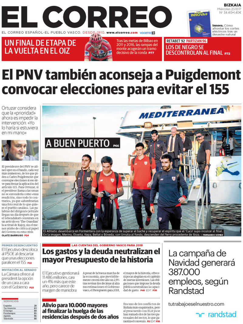 EL CORREO: "El PNV también aconseja a Puigdemont convocar elecciones para evitar el 155"; "Los gastos y la deuda neutralizan el mayor Presupuesto de la historia"; "Alivio para 10.000 mayores al finalizar la huelga de las residencias después de dos años".