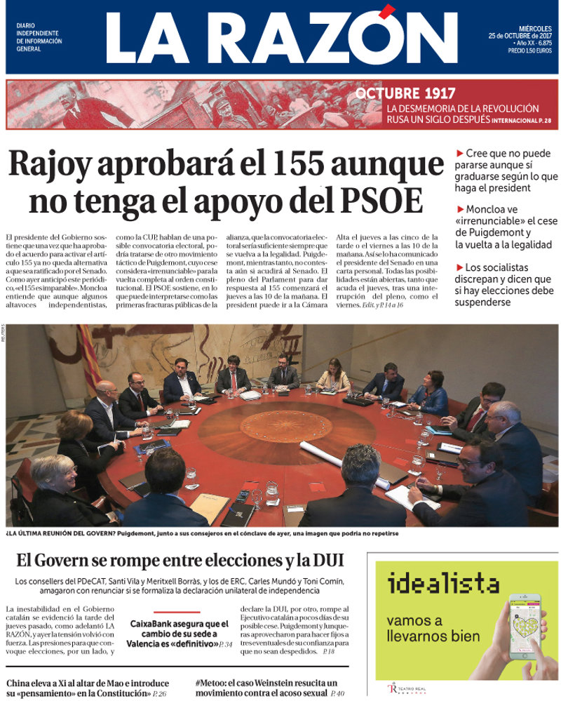 LA RAZÓN: "Rajoy aprobará el 155 aunque no tenga el apoyo del PSOE"; "El Govern se rompe entre elecciones y la DUI"; "CaixaBank asegura que el cambio de su sede a Valencia es "definitivo"; "China eleva a Xi al altar de Mao e introduce su "pensamiento" en la Constitución".