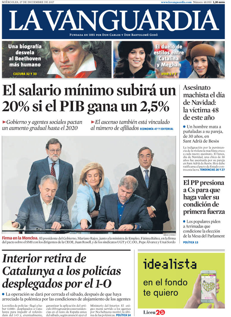LA VANGUARDIA: "El salario mínimo subirá un 20% si el PIB gana un 2,5%"; "Interior retira de Catalunya a los policías desplegados por el 1-O"; "Asesinato machista el día de Navidad: la víctima 48 de este año"; "El PP presiona a Cs para que haga valer su condición de primera fuerza".