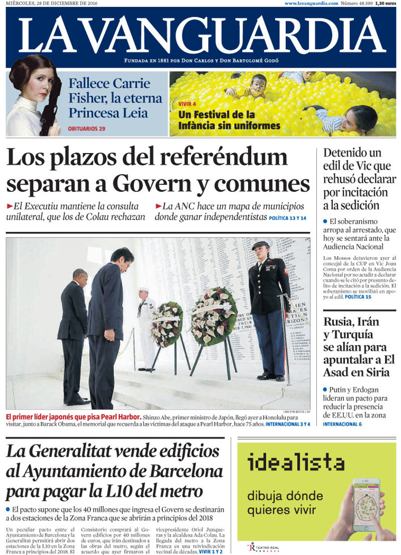 EL PERIÓDICO: "Clamor soberanista por el nuevo arresto en la CUP"; "Represalia de Israel contra España"; "Histórica visita de Abe a Pearl Harbor con Obama"; "Barcelona compra inmuebles ala Generalitat para la L-10"; "Carrie Fisher, princesa Leia, muere a los 60 años".