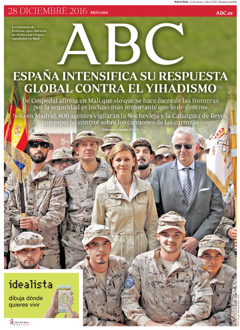 ABC: "España intensifica su respuesta global contra el yihadismo. De Cospedal afirma en Malí que "lo que se hace fuera de las fronteras por la seguridad es incluso más importante que lo de dentro". Solo en Madrid, 800 agentes vigilarán la Nochevieja y la Cabalgata de Reyes, con especial control sobre los camiones de las carrozas".