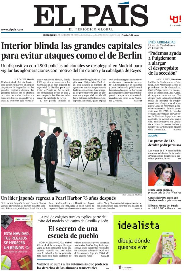 EL PAÍS: "Interior blinda las grandes capitales para evitar ataques como el de Berlín"; "Inés Arrimadas: "Podemos ayuda a Puigdemont a alargar el despropósito de la secesión"; "Un líder japonés regresa a Pearl Harbour 75 años después"; "Los presos de ETA deciden pedir permisos".