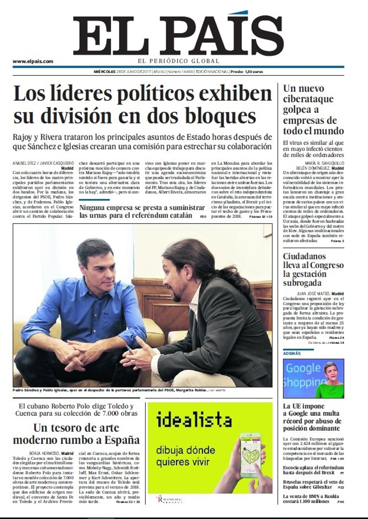 EL PAÍS: "Los líderes políticos exhiben su división en dos bloques. Rajoy y Rivera trataron los principales asuntos de Estado horas después de que Sánchez e Iglesias crearan una comisión para estrechar su colaboración"; "Ninguna empresa se presta a suministrar las urnas para el referéndum catalán"; "Un tesoro de arte moderno rumbo a España. El cubano Roberto Polo elige Toledo y Cuenca para su colección de 7.000 obras"; "Un nuevo ciberataque golpea a empresas de todo el mundo"; "Ciudadanos lleva al Congreso la gestación subrogada".