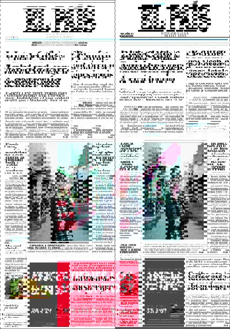 EL PAÍS: "La Junta de Castilla-La Mancha declara la guerra al cementerio nuclear"; "El PP da un fuerte giro a la derecha en vísperas electorales. Elige a dos conservadores de perfil duro para Cataluña y la Comunidad Valenciana"; "Carmena paraliza más de 2.000 desahucios"; "Rajoy advierte de que España está "en primera línea" frente al terrorismo"; "El consejo asesor de Merkel recomienda aún la salida de Grecia del euro"; "Científicos contra los robots para la guerra"; "Multa récord al sector del automóvil".