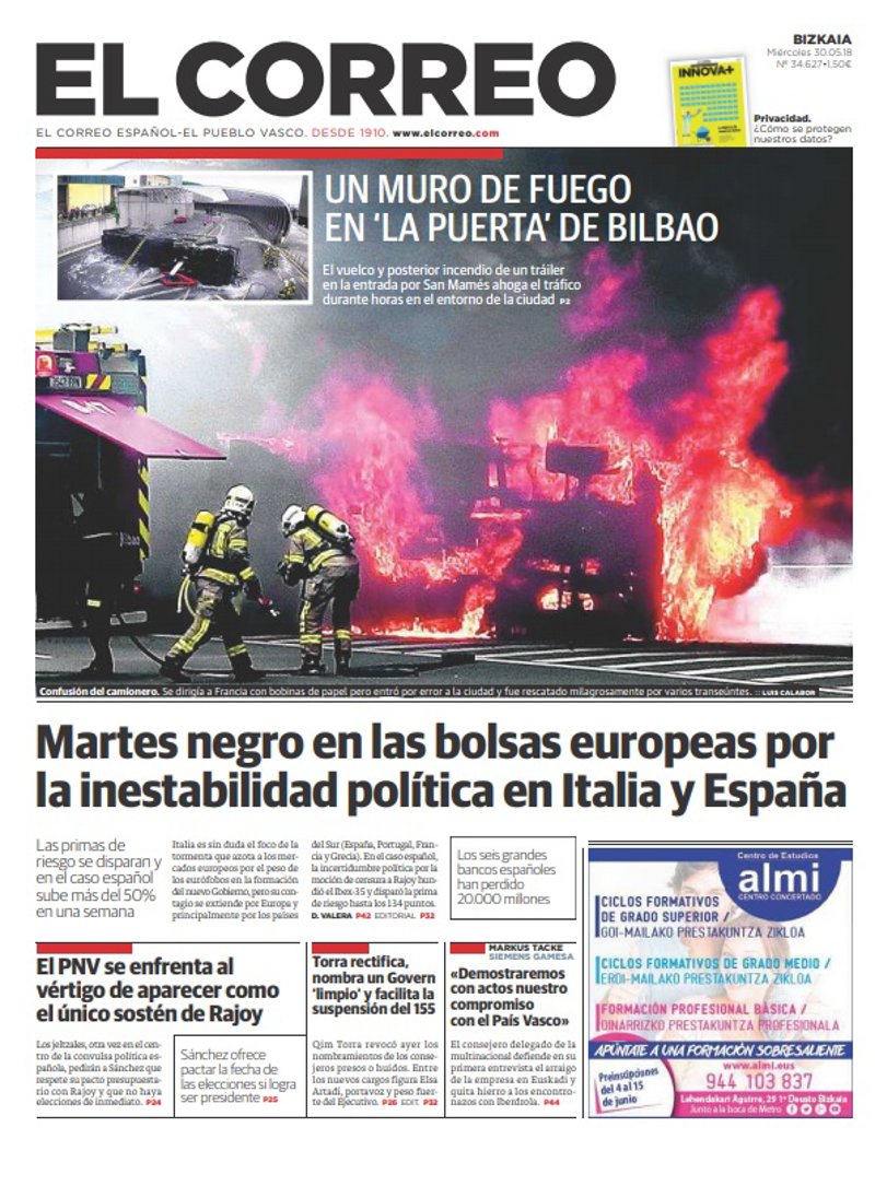 EL CORREO: "Martes negro en las bolsas europeas por la inestabilidad política en Italia y España"; "El PNV se enfrenta al vértigo de aparecer como el único sostén de Rajoy"; "Torra rectifica, nombra un Govern 'limpio' y facilita la suspensión del 155'.
