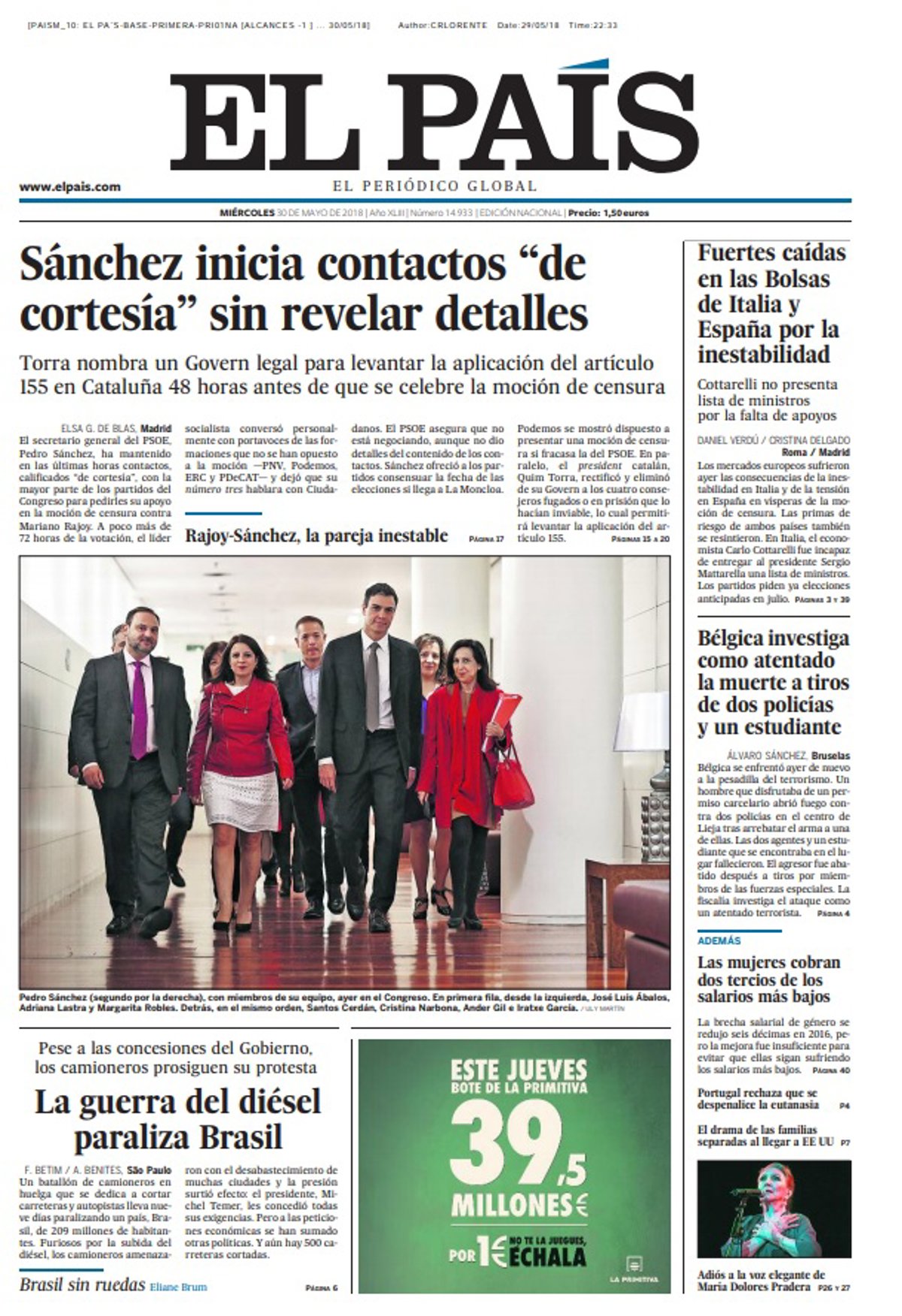EL PAÍS: "Sánchez inicia contactos 'de cortesía' sin revelar detalles"; "La guerra del diésel paraliza Brasil"; "Fuertes caídas en las Bolsas de Italia y España por la inestabilidad"; "Bélgica investiga como atentado la muerte a tiros de dos policías y un estudiante".