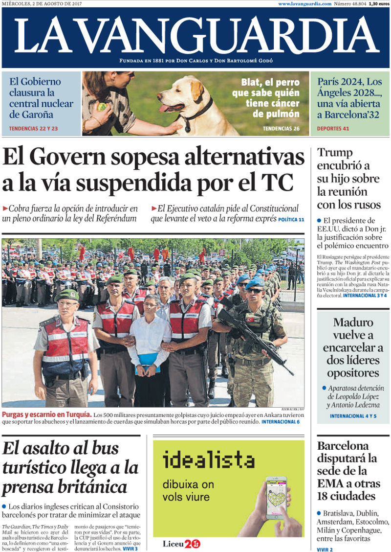 LA VANGUARDIA: "El Govern sopesa alternativas a la vía suspendida por el TC"; "El asalto al bus turístico llega a la prensa británica"; "Trump encubrió a su hijo sobre la reunión con los rusos"; "Maduro vuelve a encarcelar a dos líderes opositores"; "Barcelona disputará la sede de la EMA a otras 18 ciudades".