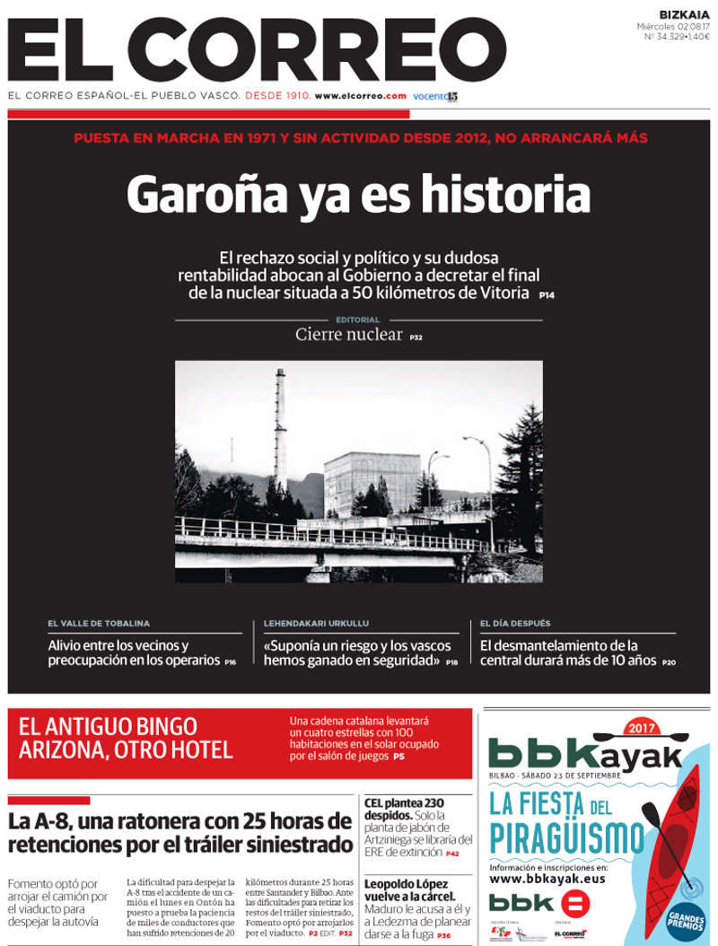 EL CORREO: "Garoña ya es historia. El rechazo social y político y su dudosa rentabilidad abocan al Gobierno a decretar el final de la nuclear situada a 50 kilómetros de Vitoria"; "La A-8, una ratonera con 25 horas de retenciones por el tráiler siniestrado"; "Leopoldo López vuelve a la cárcel"; "El antiguo bingo Arizona, otro hotel".