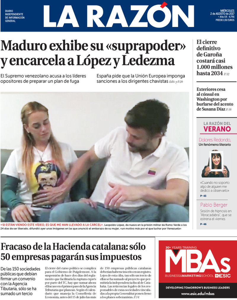 LA RAZÓN: "Maduro exhibe su "suprapoder" y encarcela a López y Ledezma"; "Fracaso de la Hacienda catalana: sólo 50 empresas pagarán sus impuestos"; "El cierre definitivo de Garoña costará casi 1.000 millones hasta 2034"; "Exteriores cesa al cónsul en Washington por burlarse del acento de Susana Díaz".