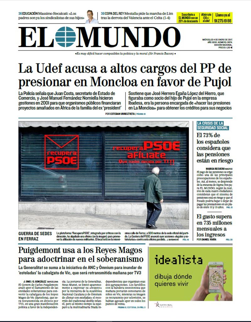 EL MUNDO: "La Udef acusa a altos cargos del PP de presionar en Moncloa en favor de Pujol"; "Guerra de sedes en Ferraz. La plataforma 'RecuperaPSOE', integrada por críticos con la dirección, ha alquilado una oficina para promover la afiliación de nuevos militantes"; "Puigdemont usa a los Reyes Magos para adoctrinar en el soberanismo"; "El 73% de los españoles considera que las pensiones están en riesgo"; "El gasto supera en 735 millones mensuales a los ingresos".