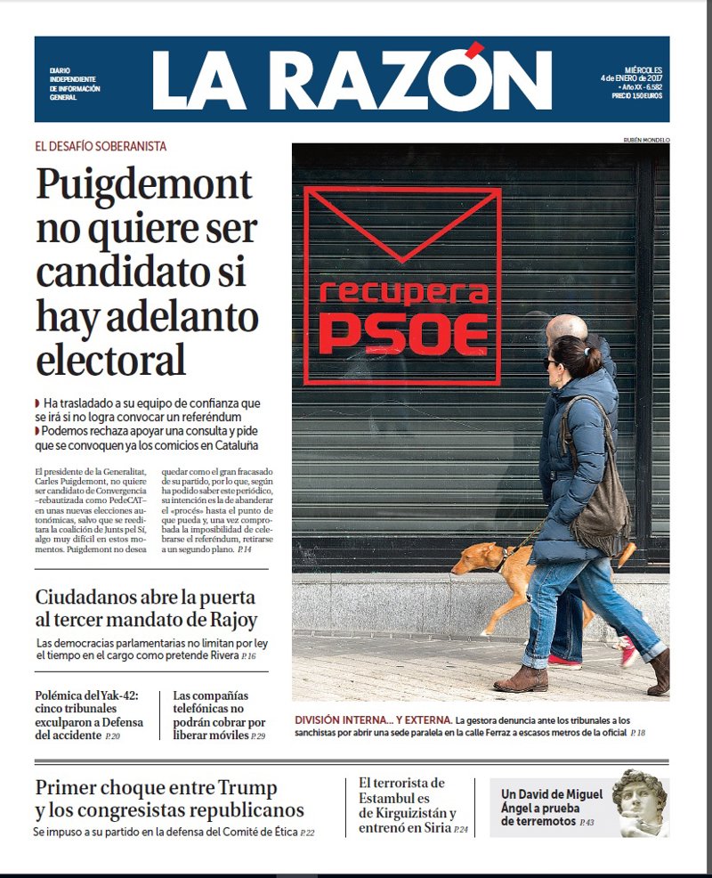 LA RAZÓN: "Puigdemont no quiere ser candidato si hay adelanto electoral"; "División interna .. y externa. La gestora denuncia ante los tribunales a los sanchistas por abrir una sede paralela en la calle Ferraz a escasos metros de la oficial"; "Ciudadanos abre la puerta al tercer mandato de Rajoy"; "Polémica del Yak-42: cinco tribunales exculparon a Defensa del accidente"; "Las compañías telefónicas no podrán cobrar por liberar móviles"; "Primer choque entre Trump y los congresistas republicanos"; "El terrorista de Estambul es de Kirguizistán y entrenó en Siria"; "Un David de Miguel Ángel a prueba de terremotos".
